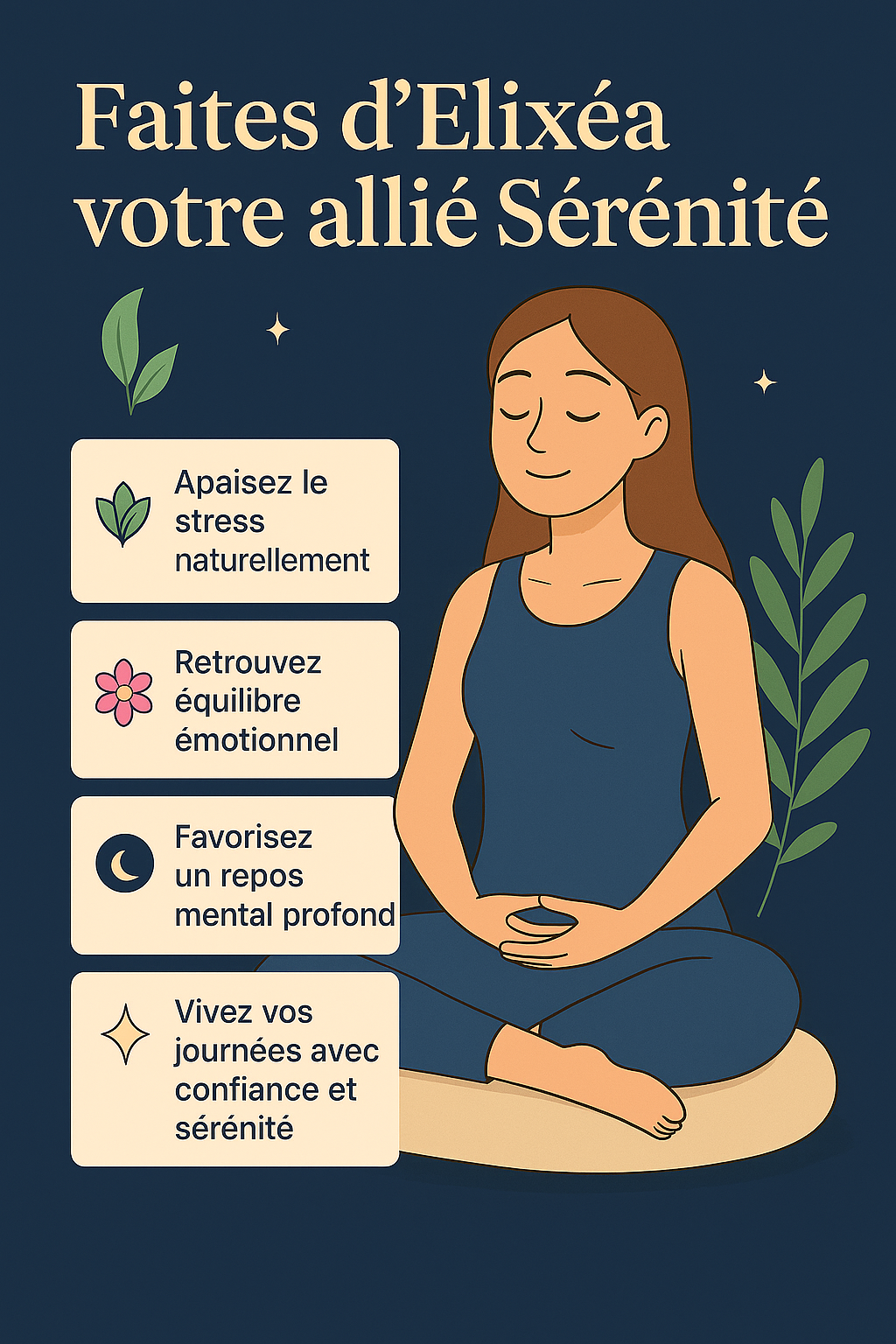 Retrouvez calme et équilibre, Elixéa aide à apaiser le stress, à réduire les pensées envahissantes et à favoriser un esprit plus léger et serein au quotidien.