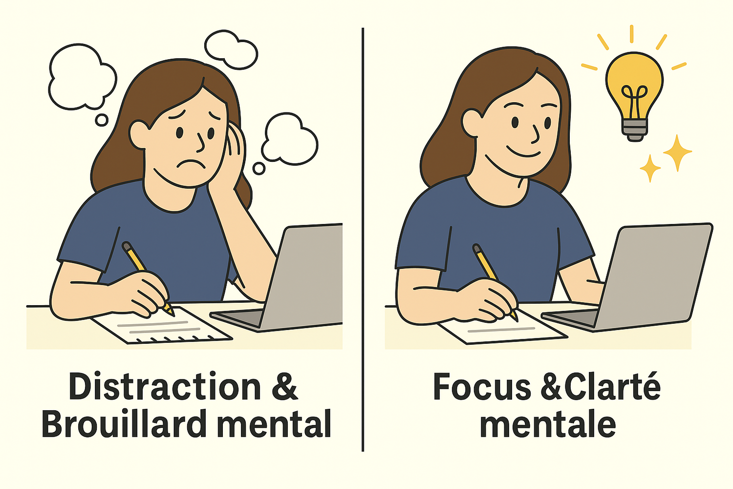 Réduit la dispersion mentale : pensées plus ordonnées, meilleures prises de décision.